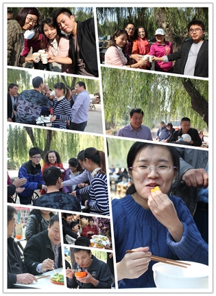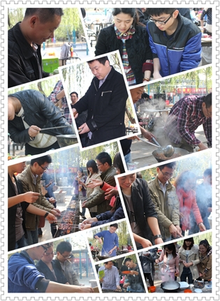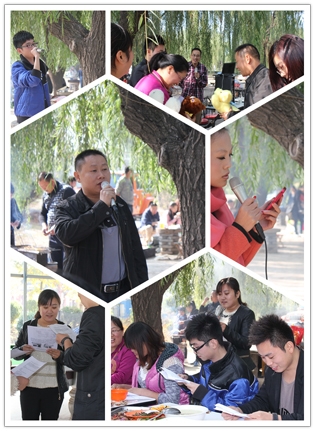 這邊美食還在回味中,那邊的節目表演已經開場了,銷售一部超越組的帥小伙云卿一亮相就震撼全場,楊宗緯的《洋蔥》模仿的象模象樣。歌聲蕩漾,婉轉飛揚,美食正在繼續中,廚藝比賽一結束,時鐘已嗒嗒地跑到了中午11:00整,大規模的團隊宴席就正式開始啦。小組成員們馬不停蹄,燒烤,爆炒,涼調,拼盤,個個都使出拿手絕活,大有一種不把現場“熱翻天就不罷休“的勢頭,除夕年夜飯的感覺盡然給烘托了出來,空氣里滿是讓人味蕾開放的各色香味兒。上菜了,上菜了,一道道精致的菜肴象一件件精美的藝術品, 成員們個個大快朵頤,觥籌交錯,美食,歌聲,小品,歡笑,各種逗趣兒,這溫馨的現場時光,成員們個個都忘記了疲倦,忘記了年齡,忘記了曾經的挫折,忘記了生活路上太多太多的沉重,取而代之的是激情,是堅韌,是快樂,是勇敢,是振奮,是沖刺,是自信,是對未來美好的憧憬和向往………