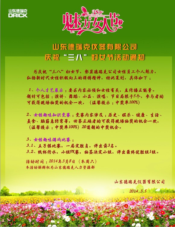 我國于1949年12月規定每年的3月8日婦女節,迄今為止已有60多年的歷史,而今年恰逢是三八婦女節第65周年。為了活躍企業文化氛圍,表彰和感謝女同胞們為公司做出的貢獻,山東德瑞克儀器有限公司決定于3月8日為所有女員工準備了一系列別開生面的歡慶活動,在表彰和感恩的同時也為德瑞克女同胞們展示個人才藝,彰顯女性風采提供了一個良好的舞臺。活動具體內容如下: